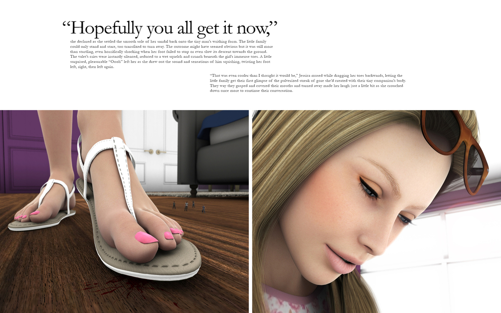 But they so aren’t. Even when they were the same size, Jessica was wealthy, powerful and gorgeous. People were eager to please her and easily bent to her whim; she just had to apply a bit more pressure when those whims were a bit more devilish. She’d always liked seeing people squirm, seeing what little sufferings she could force on them, but there’s nothing she can’t do to these minuscule, middle-class nobodies.